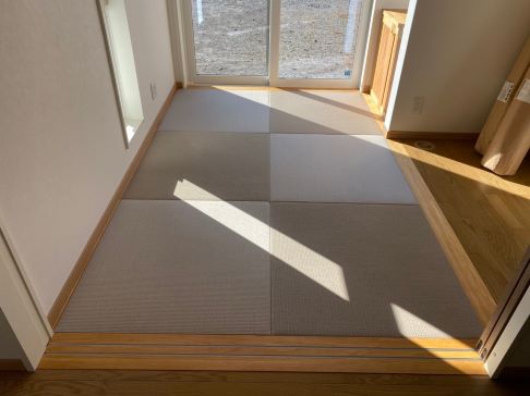 クリーニングの後、綺麗になったところに畳の搬入や玄関ドアの取り付け